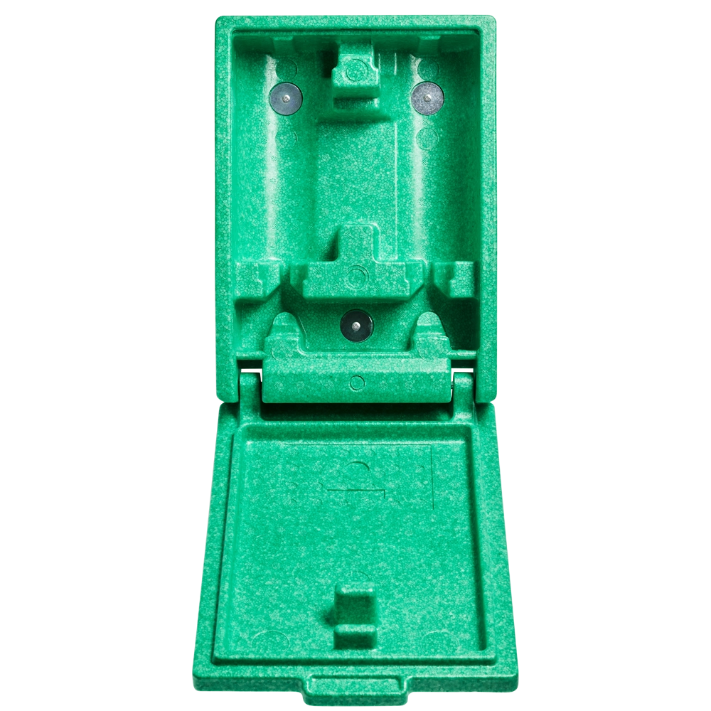 Inside the box, moulded holders keep all our wound and eyewash bottles (up to 1000 ml) securely in place – whether fitted with MONO or DUO eyecups. Constructed from polystyrene, the box is lightweight, insulating, and more environmentally friendly due to its reduced plastic content compared to fully plastic alternatives.