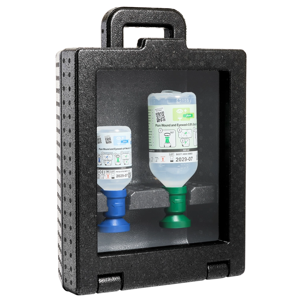 iBox is a dust-proof and portable box, and this contains 2 bottles: 1 Plum Wound and Eyewash pH Neutral 4.9% Phosphate (200 ml) providing immediate first aid in case of serious accidents involving acids and alkali and 1 Plum Wound and Eyewash 0.9% Sodium Chloride (500 ml) for rinsing after use of the Phosphate-bottle or for removal of dirt and dust in the eye or wound.