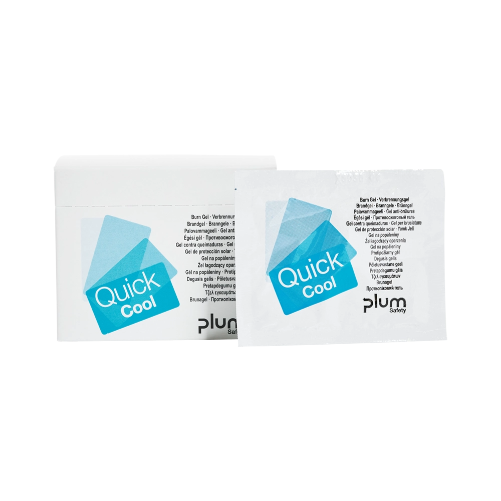 QuickCool is a burn gel designed for first aid treatment of minor burns and scalds. It provides a cooling and pain-relieving effect and contains soothing tea tree oil. The gel can be used on its own or as a refill for first aid stations.